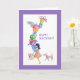 Illustration d'une fille portant une tour de cadeaux colorés, deux chiens courant aux pieds et un chat équilibré au sommet de la pile. Des cartes et des cadeaux merveilleux pour toutes les occasions.