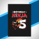 Ce design d'anniversaire ninja 5 ans présente le symbole japonais Ninjutsu, un fond de style comic book en demi-teintes et un graphique de ninja en karaté dans un style cartoon que votre garçon ou fille ninja fêtant son 5ème anniversaire ADORERA !