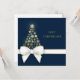 Conception de vacances luxueuse et riche avec une silhouette d'arbre de Noël splendide avec des flocons de neige dorés. Décoré avec un nœud cadeau en or blanc sur un fond bleu foncé luxuriant. Ce certificat-cadeau festif est parfait pour votre petite entreprise ou pour offrir à vos amis et à votre famille.