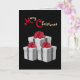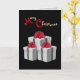 Des cadeaux gris et blancs avec de grands nœuds rouges font un beau motif pour vos invitations de vacances. Les cadeaux se détachent sur le fond noir. Les lettrages rouges et dorés ajoutent une touche de fête ! L'intérieur est à rayures grises et blanches. Personnalisez-le avec votre message et votre nom