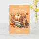 Carte d'anniversaire d'automne personnalisée pour elle avec une pile de livres, des citrouilles et un verre de café contre un arrière - plan orange créant une ambiance chaleureuse d'automne. Vous pourrez facilement personnaliser l'avant avec un nom pour ajouter une touche unique. Cette carte d'anniversaire d'automne ferait un merveilleux souvenir de carte d'anniversaire pour elle.