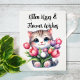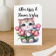 Envoyez un bouquet de joie pure avec cette adorable carte de vœux illustrée d'un chaton ! Représentant un chaton irrésistiblement mignon aux grands yeux tenant un bouquet vibrant de tulipes roses et violettes, ce design fantaisiste est parfait pour toute occasion qui appelle la douceur et les sourires. Le recto indique "Câlins de chaton et vœux fleuris" dans une élégante écriture ludique.