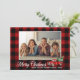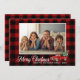 Un beau style rustique, plaid de buffle rouge - carte de vacances tartan avec une aquarelle vintage camion rouge chargé d'arbres, avec script de calligraphie "Joyeux Noël", votre nom de famille, année ou autre texte et votre photo de famille. Personnalisez votre message au dos de la carte pour une touche parfaite.