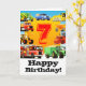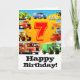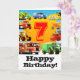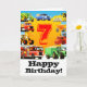 Neuf camions colorés entourent un grand nombre 7 ! Ajoutez votre âge ! Un mélangeur de béton, un camion bleu, un bulldozer jaune, un rouleau routier rouge, un tracteur vert, un gros camion de pompier rouge, une excavatrice jaune et un camion de chantier ! Toutes sortes de véhicules de construction et de transport. Parfait pour le 7ème anniversaire d'un garçon.
