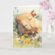 Cette carte de vœux chaleureuse présente un gros plan d'un capybara dormant paisiblement, niché parmi des fleurs sauvages colorées dans une prairie ensoleillée. Avec des tons pastel doux et un style aquarelle délicat, cette illustration fantaisiste capture un moment de calme et de contentement. L'expression sereine du capybara sur fond floral vibrant apporte un sentiment de tranquillité, faisant de cette carte un choix idéal pour les anniversaires, les vœux de bonheur ou simplement pour envoyer une touche de la paix de la nature. Idéale pour les amoureux des animaux et les fans d'art inspiré par la nature cosy, cette carte irradie de chaleur et de relaxation, célébrant la simple joie d'une sieste tranquille en plein air.