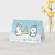 Belle caricature de pingouin gris avec casquette de fête rayé célébrant l'anniversaire du pingouin bleu avec casquette de fête pois. Un gâteau d'anniversaire avec des glaçons et surmonté d'un régal spécial - un poisson orange, est servi dans le cadre de la célébration. Légende amusante : "J'espère que vous aimez le gâteau !" Hmm... du gâteau de poisson ? Un bel arrière - plan de neige pour compléter le design. Dégustez vos amis avec cette carte de voeux d'anniversaire adorable et drôle. Design par Rusty Doodle.