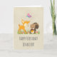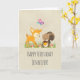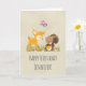 Bonne carte de voeux d'anniversaire avec une jolie illustration montrant un cerf de bébé et un petit écureuil tenant une glande et un papillon volant au-dessus de leur tête. Ces adorables créatures boisées se tiennent debout sur une herbe avec quelques champignons fantaisistes à leurs pieds. L'Arrière - plan a un look de papier kraft brun.