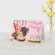 Carte d'amusement avec un carlin mignon utilisant un casquette tacheté de partie célébrant quelqu'un anniversaire avec les bougies, le gâteau et les flammes.