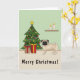 Souhaitez Joyeux Noël à vos amis et à votre famille avec l'aide de ce thème festif de chien avec l'illustration originale de Destei d'un adorable manteau couleur Carlin chien de race. Le chien est debout près d'un sapin de Noël festif orné d'ornements rouges et jaunes, d'une guirlande de perles blanches et d'une étoile jaune posée sur le sommet de l'arbre. Il y a aussi deux cadeaux emballés par l'arbre. La couleur du sol est beige et la couleur du mur arrière - plan est vert clair. Il y a aussi une zone de texte personnalisable qui se lit maintenant : "Joyeux Noël !".