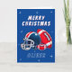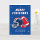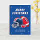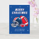 Casque de balle de football Caricature Joyeuse carte de Noël. Carte de Noël de football moderne et amusante. Avec une illustration audacieuse d'un ballon de football et d'un casque de couleurs bleu et rouge. Ajoutez votre nom.