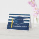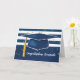 Célébrez avec un diplômé avec cette carte brillante et forte de graduation. De larges bandes et confettis composent l'arrière - plan, avec un casquette bleu et une moustiquaire jaune or. Idéal pour un type ou une fille.