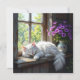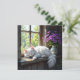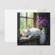 Une carte sucrée avec un chat blanc et moelleux faisant la sieste sur un rebord de fenêtre rustique à côté d'un joli vase de fleurs violettes. Le dos est vide pour que vous puissiez écrire votre propre note.