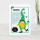 Une carte de voeux amusante pour votre petit-fils le jour de la Saint Patrick, avec un joli leprechaun dansant, tenant un shamrock, à côté d'une casserole d'or. Il y a une bordure vert foncé, doublée et la Prière celtique d'origine, en lettres vertes, à côté du leprechaun. Le leprechaun a un très grand casquette, dans un motif vert, une grande barbe de gingembre, un nez énorme, des manches rayées et des chaussettes et des chaussures noires avec des boucles pour assortir son bandeau. En haut, en lettres noires, se trouve le mot "GRANDSON" et le message intérieur est facile à customiser ou à supprimer.