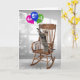 Chat tabby en bois debout sur un rocking chair et tendant vers un bouquet de ballon coloré pour 27ème anniversaire. Le numéro d'âge peut être modifié.