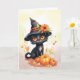 Cette belle carte d'Halloween présente un mignon chat noir aux yeux enchanteurs, un casquette et des citrouilles, ainsi qu'une marguerite orange. Souhaitez à quelqu'un une journée extraordinaire et magique ! Purr-fect pour cet amoureux des chats !