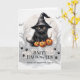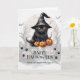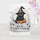 Bonne carte Halloween avec un mignon chat noir portant un casquette, des citrouilles éffrayants, des chauves-souris volantes et la pleine lune. Personnalisez facilement cette belle carte d'Halloween aquarelle avec votre nom de famille, photo et texte.