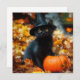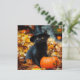 Carte avec un adorable chat noir portant un casquette de sorcière ! Cette petite mignonne pose avec un citrouille. Les feuilles d'automne tapis le sol de la forêt. Un cadeau parfait pour les fêtes d'Halloween !