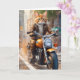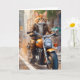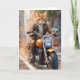 Adorable chat tigré orange en veste et pantalon marron en balade à moto sur cette carte de vœux vierge.