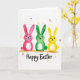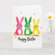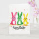 This greeting card shows three stylized long-eared creatures standing side by side on a bright white background, like friends posing close for a photo 🐰. One is painted in rich pink, the next in deep green, and the third in sunny yellow, each with soft watercolor-like washes that let a little of the white space glow through. Their wide dark eyes and small curved smiles give them a gentle, affectionate look, as if they’re quietly cheering each other on. A light earthy brushstroke beneath their feet suggests a simple ground line, keeping the trio centered and steady. Tiny scattered speckles in coordinating colors float around them like confetti, adding a light springtime lift 🌷. Each creature has a small star-shaped tail that stands out as a sweet little detail. The greeting text sits below the characters, written in flowing hand-lettered strokes in a dark ink tone. The trio remains aligned across the middle, with the speckles and star tails punctuating the open white space.