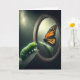 Une chenille verte regarde le reflet d'un beau papillon monarque dans un miroir ovale.