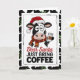 Cette carte de fête présente une vache fatiguée mais adorable avec un chapeau et une écharpe de Père Noël tenant une tasse de café avec le message Cher Père Noël Apporte Juste du Café. Parfait pour les amateurs de caféine, les lève-tôt et tous ceux qui survivent à l'effervescence des fêtes avec une tasse chaude à la main.