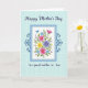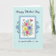 This card features a tall layout with a bright bouquet centered inside a white rectangular panel, like a fresh gift offered with affection ❤️. The flowers mix fuchsia, soft pink, sunny yellow, calm blue, and gentle purple petals, tucked among leafy greens and tiny star-like accents that feel like a sweet shared moment. A double-lined border in medium and light blue wraps the panel, giving the bouquet a cozy, embraced look. Decorative dark blue swirls sit to the left and right, adding an old-fashioned touch without feeling heavy. Near the top edge of the frame, a small deep-blue bird rests as if pausing to watch over the scene 🌼. The background is pale aquamarine with a faint grid texture that keeps everything airy and light. Dark indigo lettering appears above the framed bouquet and again below it, set in flowing cursive-style text. The upper line sits centered near the top margin, while the lower line is centered beneath the frame in the same dark indigo color.