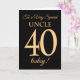 Une carte d'anniversaire chic 40ème pour un "Très Special Uncle", avec un numéro 40 composé de numéros à effet or et le mot "Oncle", à effet or, sur un arrière - plan noir. Le message intérieur, que vous pouvez modifier si vous le souhaitez, est "Joyeux anniversaire"