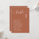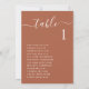 Carte chic en terre cuite mariage avec "table" dans un élégant script blanc avec des swashes, le numéro de table dans la typographie classique blanche serif et les noms de vos invités en lettres blanches modernes. Créez chaque tableau de sièges de table et ajoutez-y un à la fois à votre panier, puis retirez-le une fois que toutes les tables sont dans votre panier.