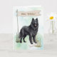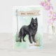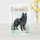 Elégant et alerte, le Sheepdog belge se distingue par son aquarelle herbacée, son manteau noir luxuriant qui attire la lumière sous une bannière d'anniversaire fantaisiste. Un os voisin ajoute une touche ludique à cette carte conçue pour quelqu'un de loyal, intelligent, et toujours prêt à prêter une patte d'aide.