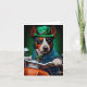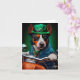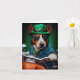 Un ami à fourrure derrière le guidon d'un vélo vert brillant, portant une tenue de Saint-Patrick verte qui fait tourner les têtes. Le chien est vêtu d'une tenue de fête, avec un nœud papillon vert et un haut-de-forme assorti qui se pose bien sur sa tête. La tenue présente des motifs complexes de trèfles et de lutins, ce qui montre clairement que ce chien est prêt à célébrer la Saint-Patrick dans le style.
