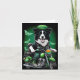 Un ami à fourrure derrière le guidon d'un vélo vert brillant, portant une tenue de Saint-Patrick verte qui fait tourner les têtes. Le chien est vêtu d'une tenue de fête, avec un nœud papillon vert et un haut-de-forme assorti qui se pose bien sur sa tête. La tenue présente des motifs complexes de trèfles et de lutins, ce qui montre clairement que ce chien est prêt à célébrer la Saint-Patrick dans le style.