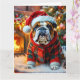 Une jolie scène de Noël avec un doux Bulldog anglais portant un chapeau de Père Noël et un pull rouge assis à côté d'un sapin de Noël et d'une cheminée chaude. Comprend un message original et drôle de Noël que les amoureux de les chiens sont sûrs d'aimer.