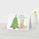 Cette carte de Noël personnalisable a un adorable chien qui est enchevêtré dans des lumières assis à côté d'un sapin de Noël, sous la neige qui tombe. Les mots "Joyeux Noël" sont au-dessus du chien.