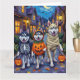 Les adorables Malamutes d'Alaska vêtus de costumes d'Halloween ludiques portent des seaux citrouilles tout en trompant ou en traitant sous le ciel illuminé par la lune. Ce design festif met en valeur l’épais manteau de la race, sa construction robuste et son esprit aventureux, capturant parfaitement l’atmosphère éffrayante et amusante de la nuit d’Halloween. Une délicieuse célébration pour les amoureux de les chiens comme pour les amateurs d'Halloween.