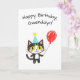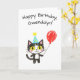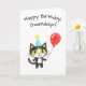 Don't let the kid's coloring art style fool you, this birthday card can be given to anyone, young or young-at-heart. It features a black and white tuxedo cat in a blue and yellow birthday hat and holding a red balloon. All text can be changed by the buyer; just follow the "Personalize this template" link. AI-generated by IveyCottage.