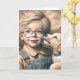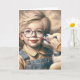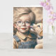 Un mignon petit garçon blond aux cheveux tourbillonnés et lunettes avec un chiot léchant son visage pour un anniversaire. Le texte peut être modifié.