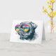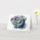 Ce design présente un carlin qui regarde à travers des lunettes de soleil sur une scène tropicale.