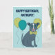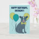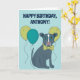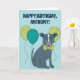 Souhaitez un joyeux anniversaire avec style avec ce beau chiot. Cette carte de vœux personnalisée présente une illustration d'un chiot pitbull portant des lunettes et un nœud papillon entouré de ballons. Le message sur le devant et à l'intérieur de cette carte peut être personnalisé avec votre propre texte.
