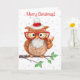 Drôle hibou avec casquette Père Noël et lunettes rouges montrant signe de poitrine, Joyeux Noël.