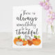 En dehors de la carte dit : Il ya toujours quelque chose à remercier pour. Décoré de citrouilles d'aquarelle et de taches d'or. A l'intérieur : Je vous souhaite un Bon thanksgiving ! (peut-être customisé) Verse de la Bible : Remerciez le Seigneur, car Il est bon; Son amour perdure pour toujours. Psaume 107:1