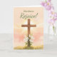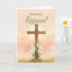 A glowing sunrise radiates behind a wooden cross while white lilies bloom beneath it, symbolizing renewal and Resurrection hope. The uplifting proclamation Rejoice celebrates Easter morning in a soft watercolor style. This customizable Christian greeting allows you to add a special name, creating a personal and meaningful way to share faith filled Easter blessings.