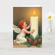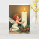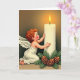 This picture shows an angel next to a tall candle, looking up at the flame with wonder. The angel has red hair, rosy cheeks, and blue eyes, wearing white clothes and wings. The candle gives off a warm golden light, making everything peaceful. There are pine boughs and pinecones at the bottom, making it feel cozy. The background is textured, making the angel and candle stand out. It feels calm and hopeful, like a Christmas scene. The contrast between the angel's red hair and the candlelight is beautiful. This card is perfect for sharing holiday joy! 🎅🏼🎄🎁