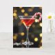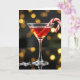 A vibrant red cocktail garnished with a classic peppermint candy cane and surrounded by golden lights bokeh creates a festive atmosphere perfect for the holidays