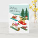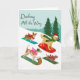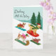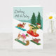 This Christmas design has four different dogs on sleds going down a snow packed hill in the mountains. The dogs are wearing hats, scarfs, goggles and ear muffs. The text says, “Dashing All the Way.”