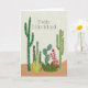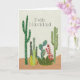 This Christmas Card has six different colorful cacti, two decorated with Christmas lights and the text, “Feliz Navidad.”