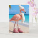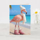 A charming flamingo, adorned with a cozy knit hat, scarf, and pink boots, is gracefully standing on a picturesque tropical beach