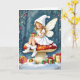 A pretty little fairy in a cute white winter dress, winter hat and furry boots sitting atop a whimsical mushroom covered in Christmas lights and surrounded by gifts. Inside is a sweet holiday poem with a cottage core Christmas vibe.