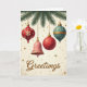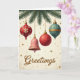 This holiday card shows a classy display of ornaments against a creamy background with golden stars and sparkles. There are pine branches in deep green with four unique ornaments hanging on chains. Two red ornaments, a pink bell, and a teal-blue ornament create a vintage-inspired color scheme. One red ornament has a white snowflake design with turquoise jewels, while the other has a golden pattern. The pink bell has golden floral details, and the teal ornament has vertical stripes with gold accents. At the bottom, the word "Greetings" is written in fancy gold letters, adding to the festive feel. This card captures a cozy and joyful holiday spirit, perfect for spreading cheer. 🎅🏼🎄🎁 Share this card to send holiday well-wishes to loved ones!