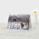 A cute country western Christmas Season's Greetings card with a long horn cow, in a fence and a cute barn with a Christmas tree and wreath. All in snow,