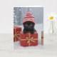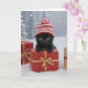 A cute little black cat wearing a stylish cap, resting his paws on a beautifully wrapped package. A charming and fun Christmas holiday card.